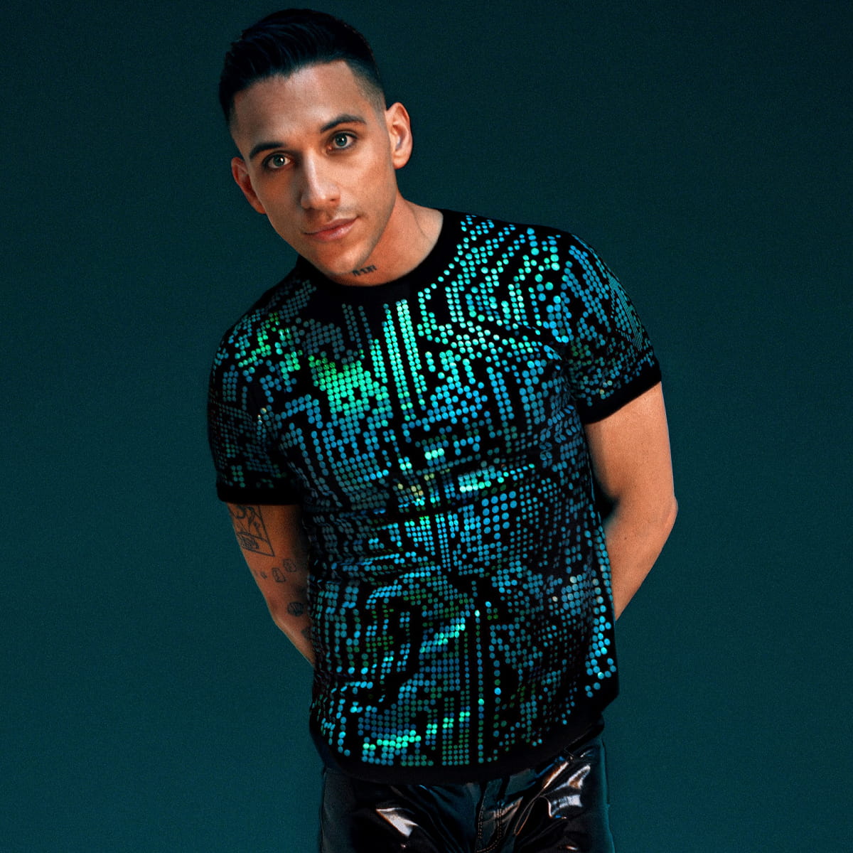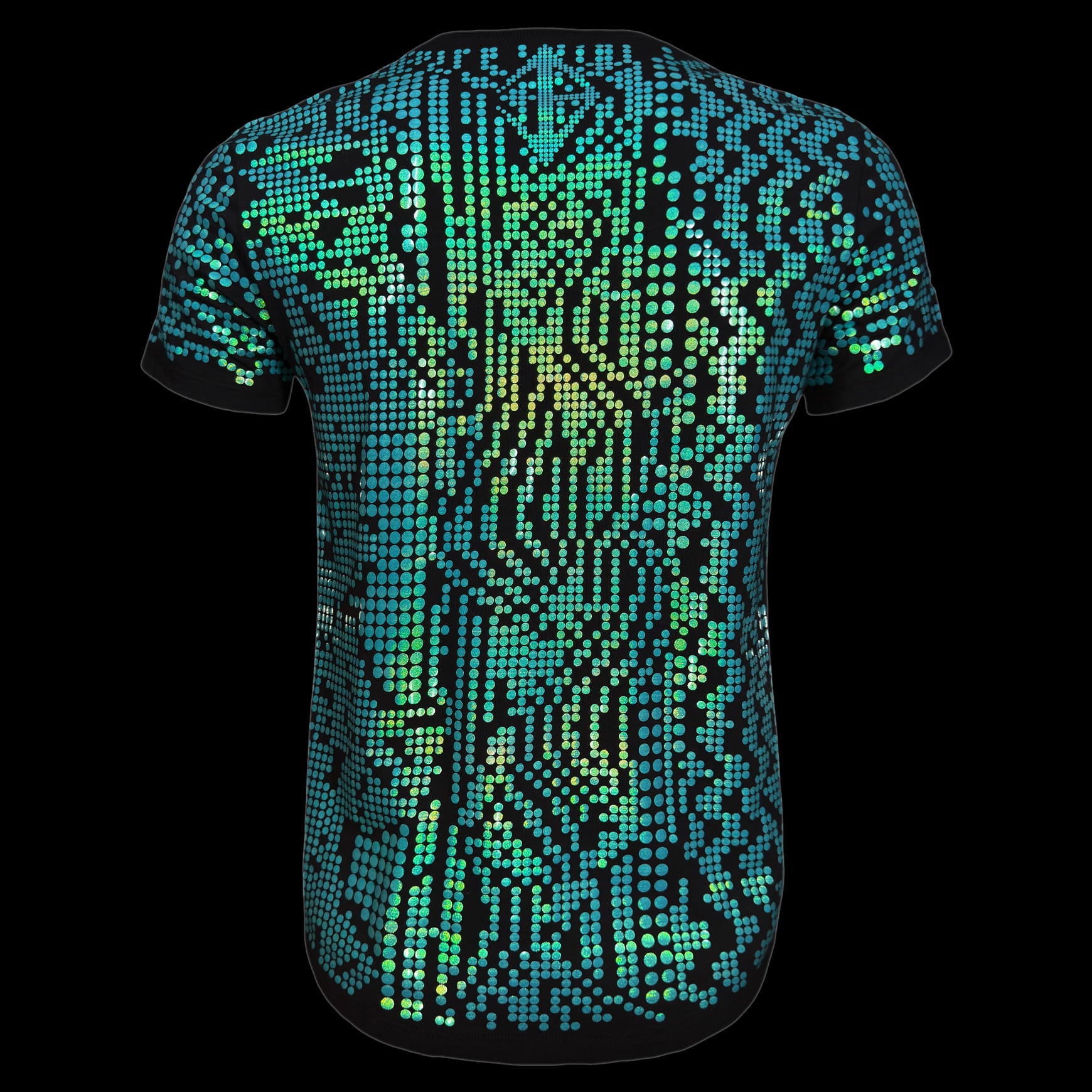 The surface treatment is precision-placed over a soft cotton base and finished with a glossy, iridescent sheen. Electric teal tones shift between cool cyan and charged green, creating depth that changes naturally as light moves across the surface.